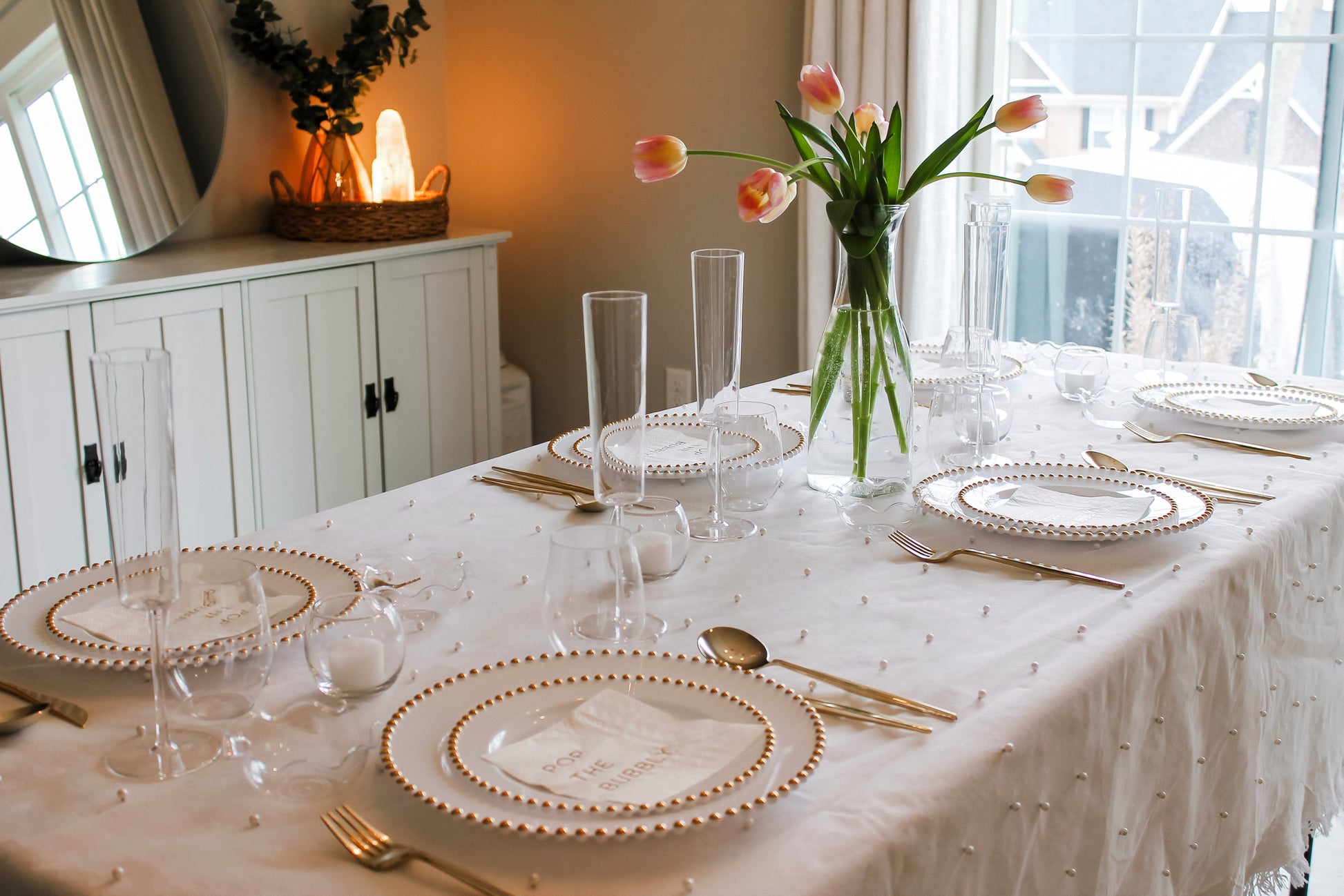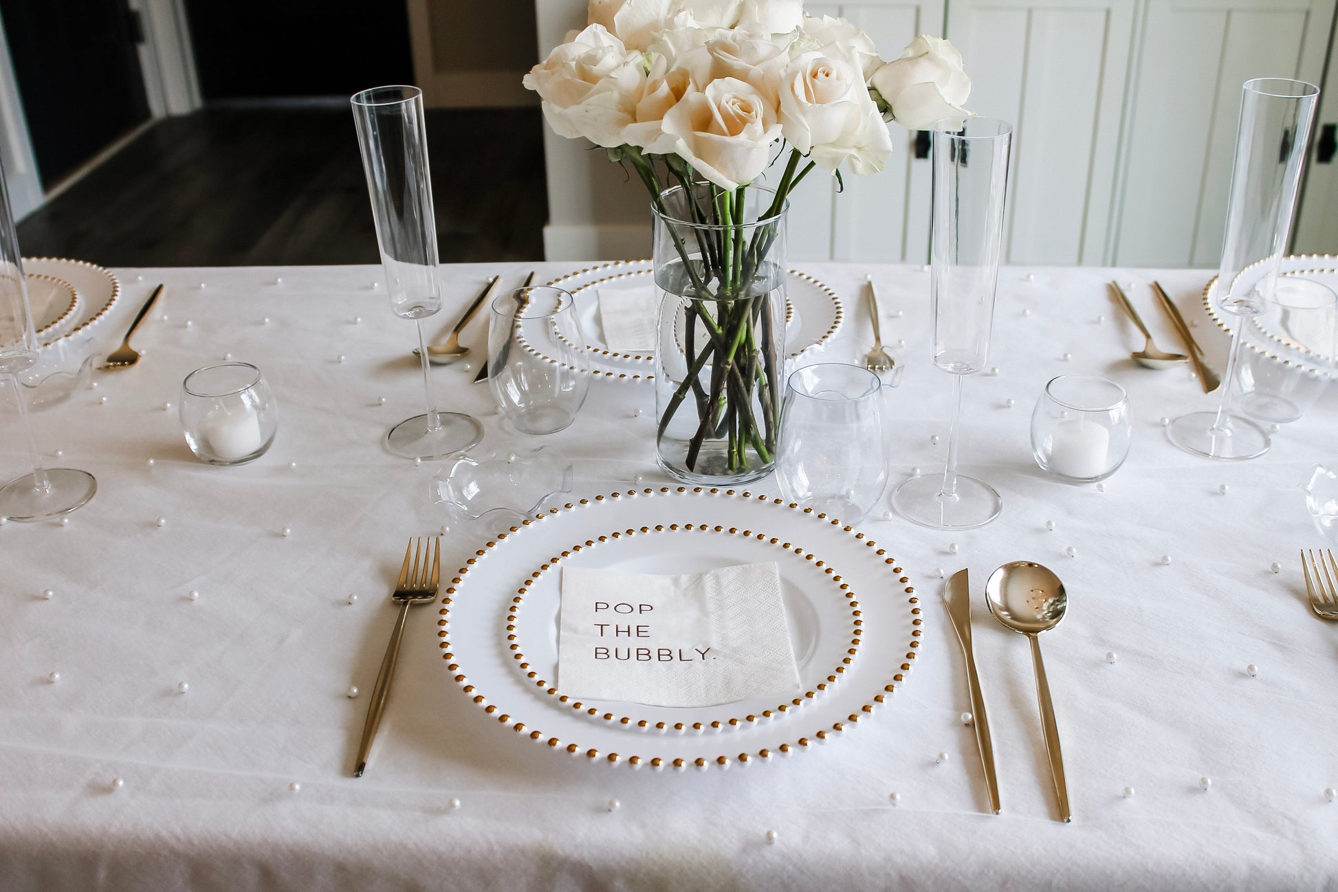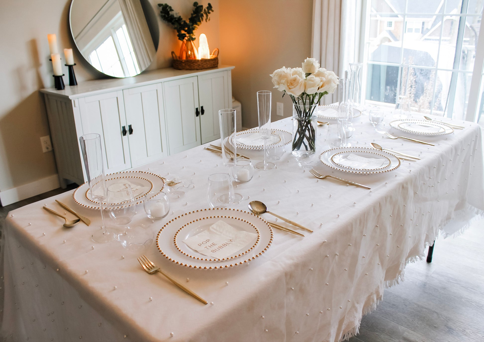 Please note: The images featuring the Transparent Ivory & Pearl Studded Table Runner/Tablecloth include a white tablecloth underneath, which is not part of this crate. If you choose to use only the Transparent Ivory & Pearl Studded Table Runner/Tablecloth provided in this crate, the table underneath will be visible.